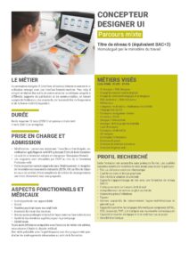 L’ensemble des modules de formation permet de se présenter au titre professionnel de niveau 6 (équivalent BAC+3) de Concepteur Designer UI.