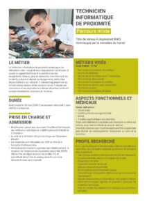 Le technicien informatique de proximité accompagne les utilisateurs dans l’usage de leurs équipements numériques. Il assure le support technique et la maintenance des équipements réseaux, gère les demandes d’assistance et les incidents, prépare et déploie les équipements, veille à leur disponibilité et à leur sécurité. Il intervient également sur les infrastructures réseaux et les solutions cloud. Il adapte son vocabulaire et ses explications à chaque utilisateur, en tenant compte d’éventuelles situations de handicap.
